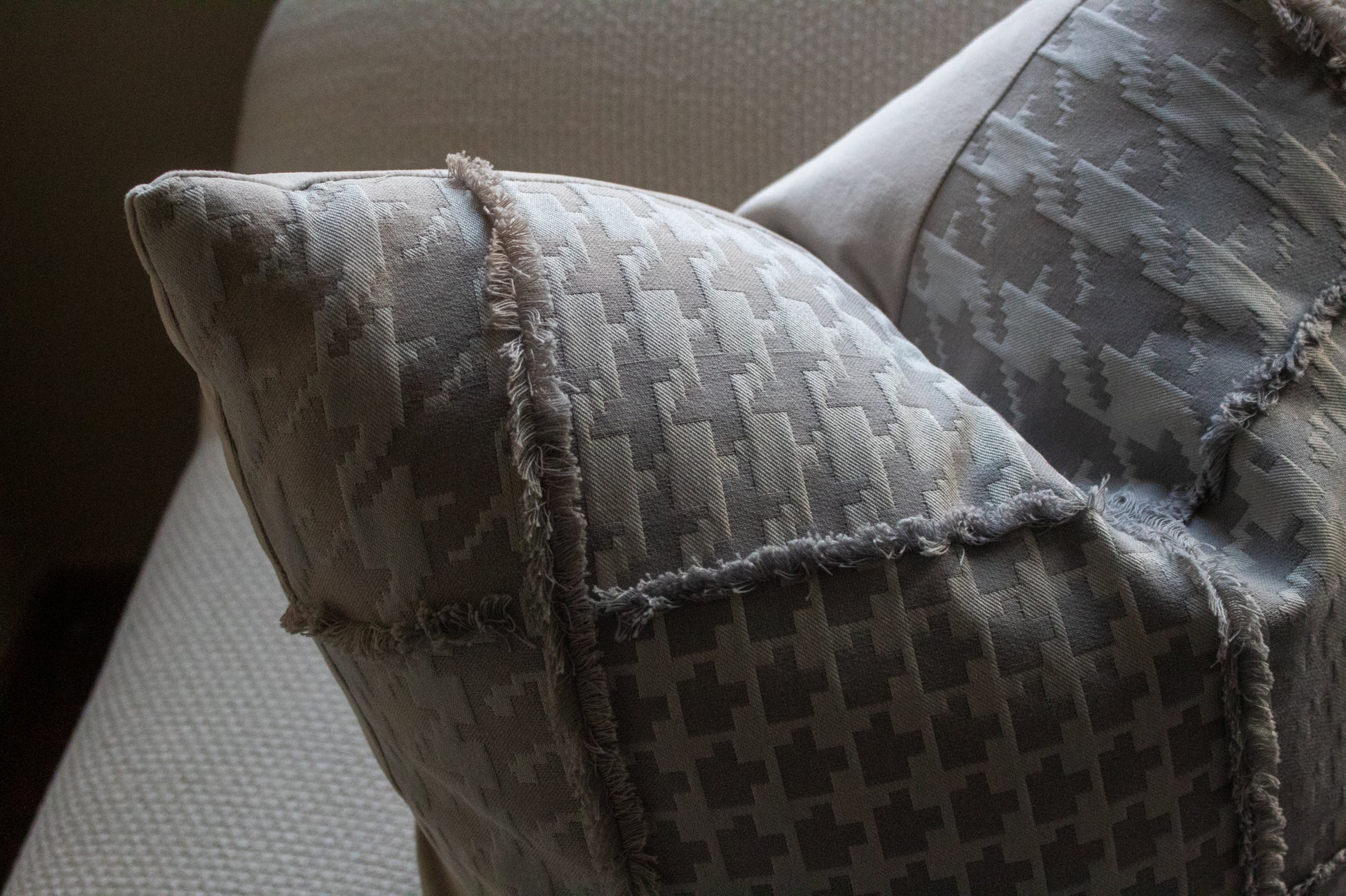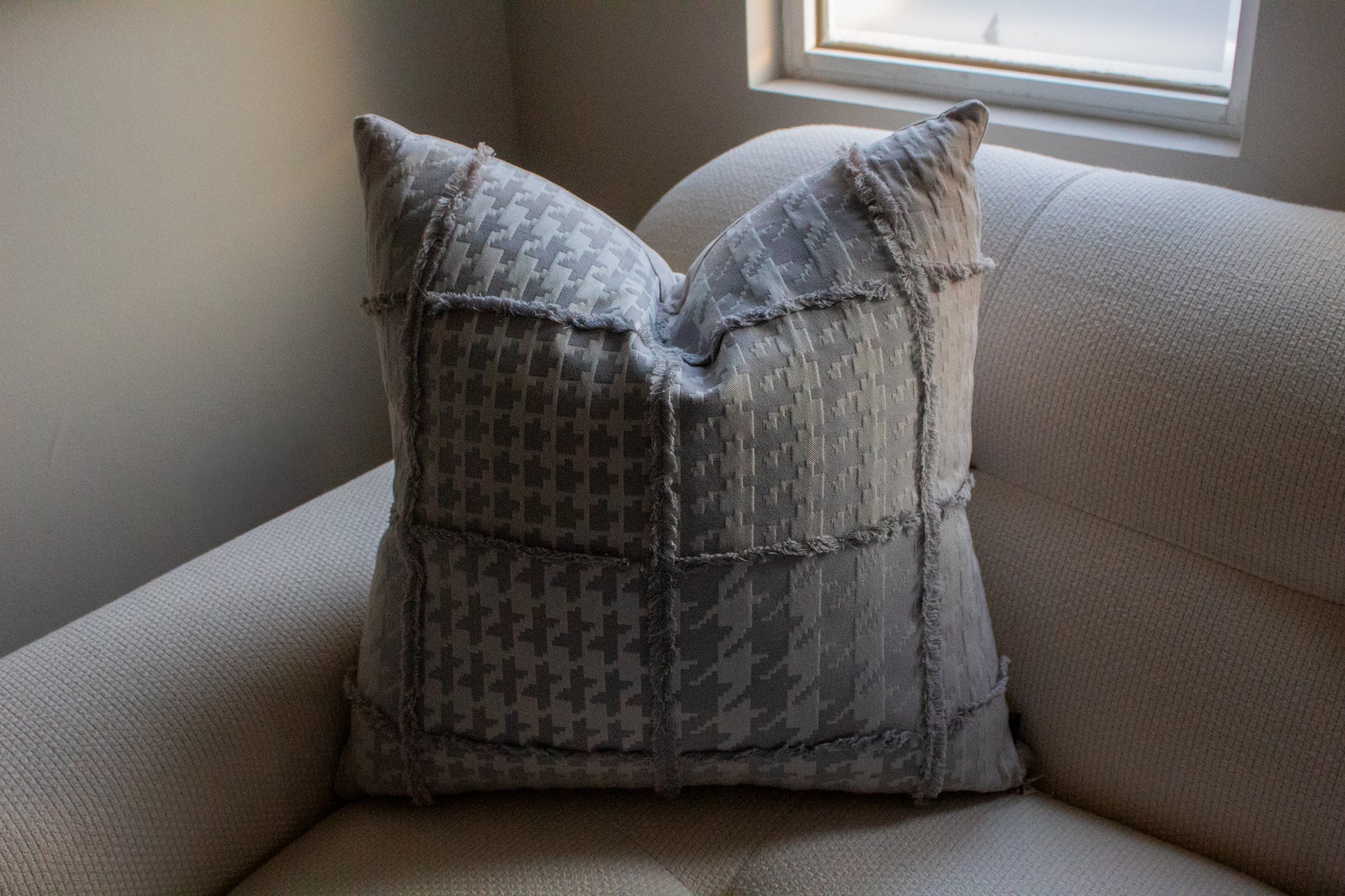 Cojín decorativo de tela con una textura agradable y suave, relleno con pluma y delcrón para un confort superior. Frente con diseño inspirado en la tela Binary Titanium de Kirkby Design, con un patrón geométrico tipo houndstooth reinterpretado en bloques que crean una estética digital y contemporánea, en una paleta de grises sofisticados, y reverso en tela tipo velvet.