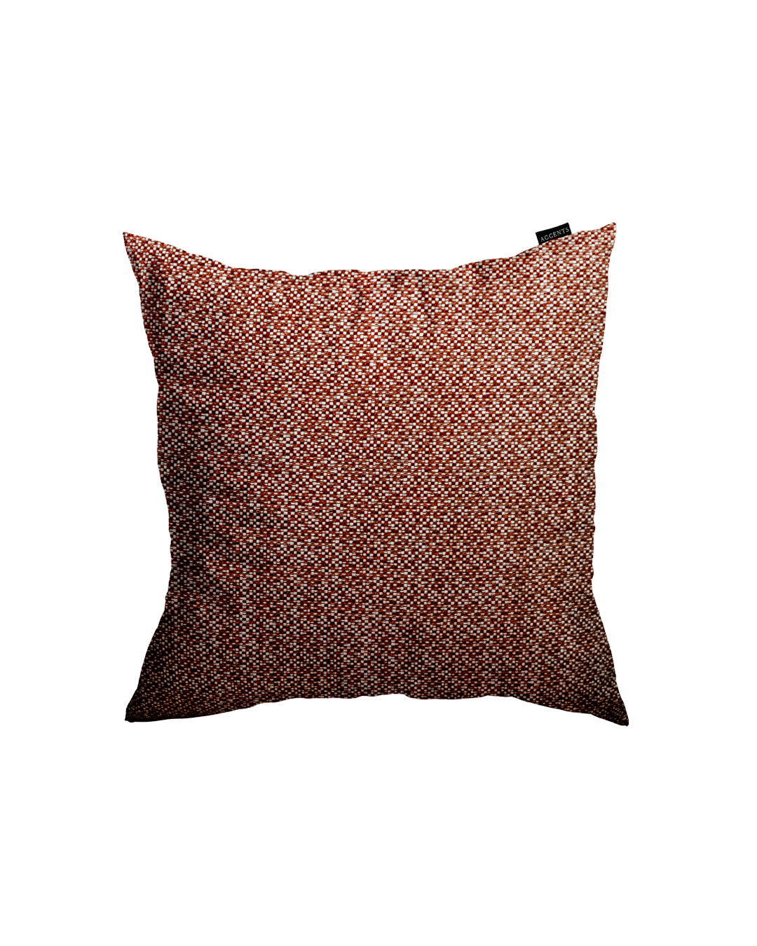 Cojín en tejido multicolor con predominancia en rojo, matizado en naranja y blanco, con estilo mosaico de escala mínima y cobertura total. Su textura rica y táctil recuerda al bordado artesanal, con un acabado visual que sugiere un efecto granulado vibrante pero equilibrado.