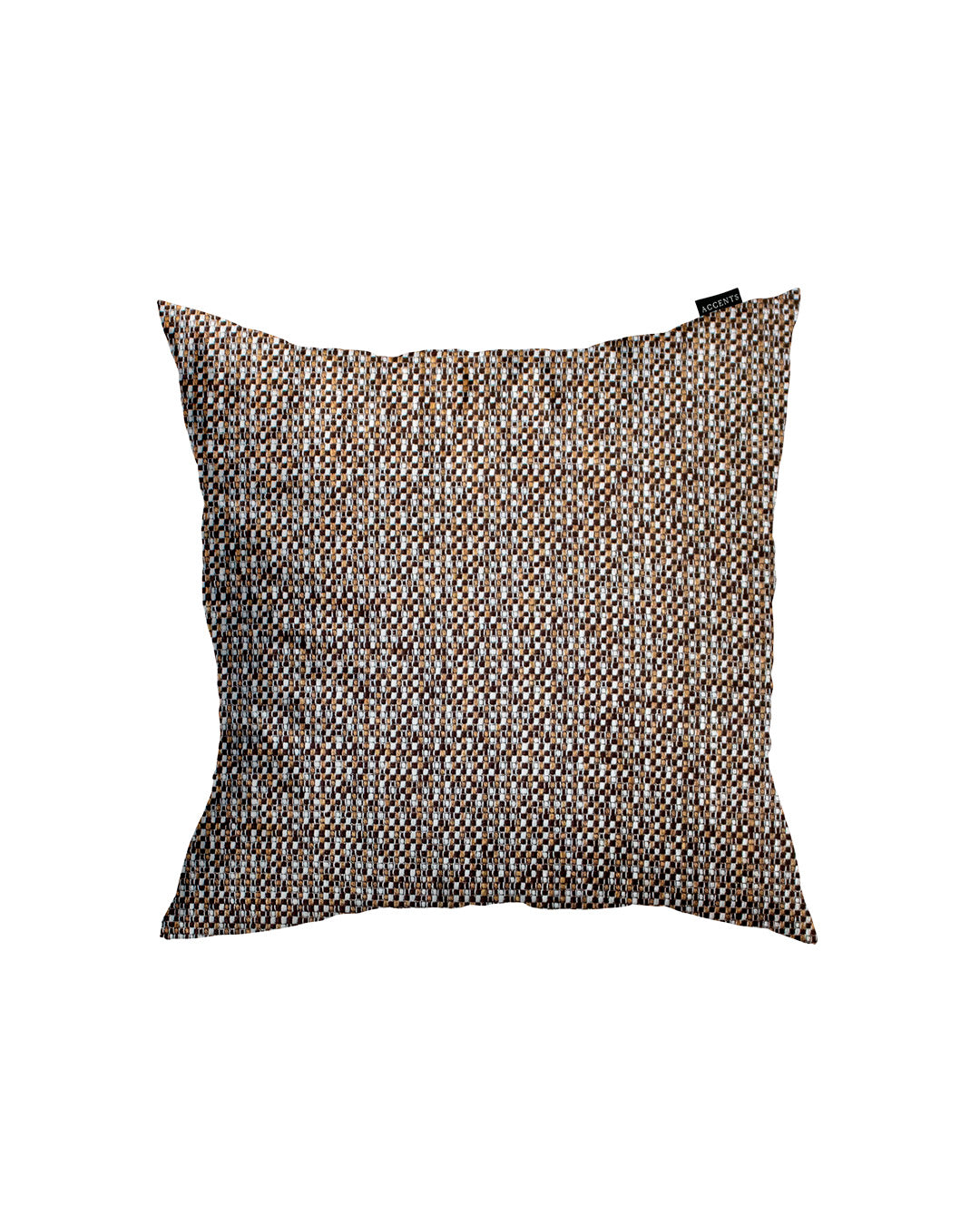 Cojín en tejido multicolor con predominancia en gris, matizado en beige y blanco, con estilo mosaico de escala mínima y cobertura total. Su textura rica y táctil recuerda al bordado artesanal, con un acabado visual que sugiere un efecto granulado vibrante pero equilibrado.