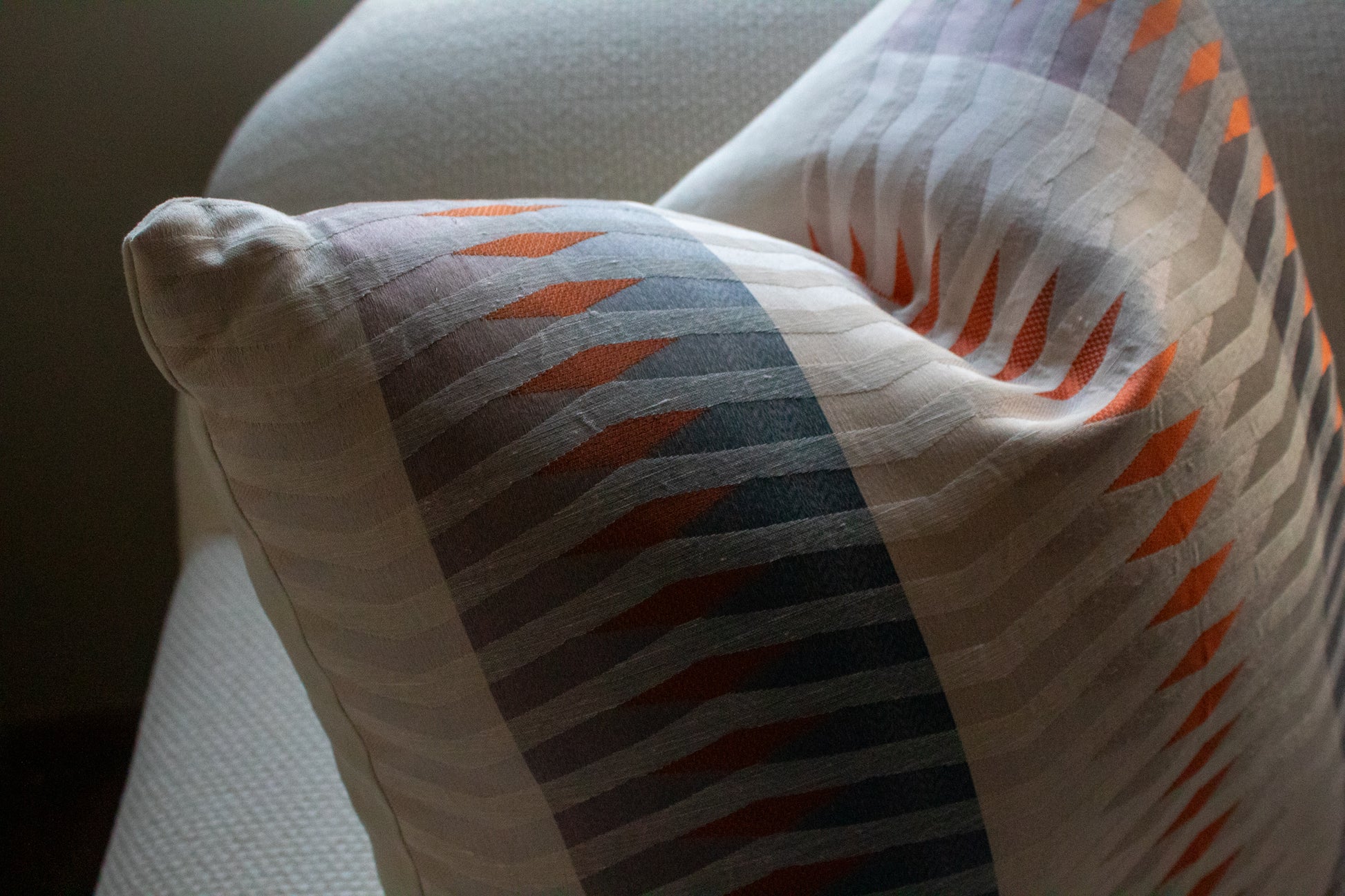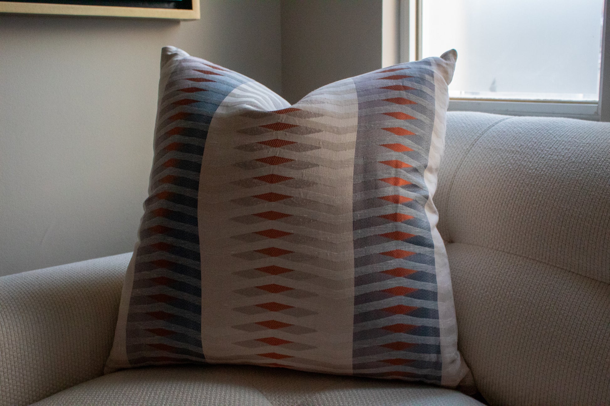 Cojín decorativo de tela con una textura agradable y suave, relleno con pluma y delcrón para un confort superior. Frente con diseño inspirado en la tela Cabello Cinnamon de Villa Nova, con un patrón geométrico lineal y repetitivo en franjas verticales que combinan tonos neutros con acentos cálidos en terracota y azul, evocando una estética textil artesanal contemporánea, y reverso en tela tipo velvet.