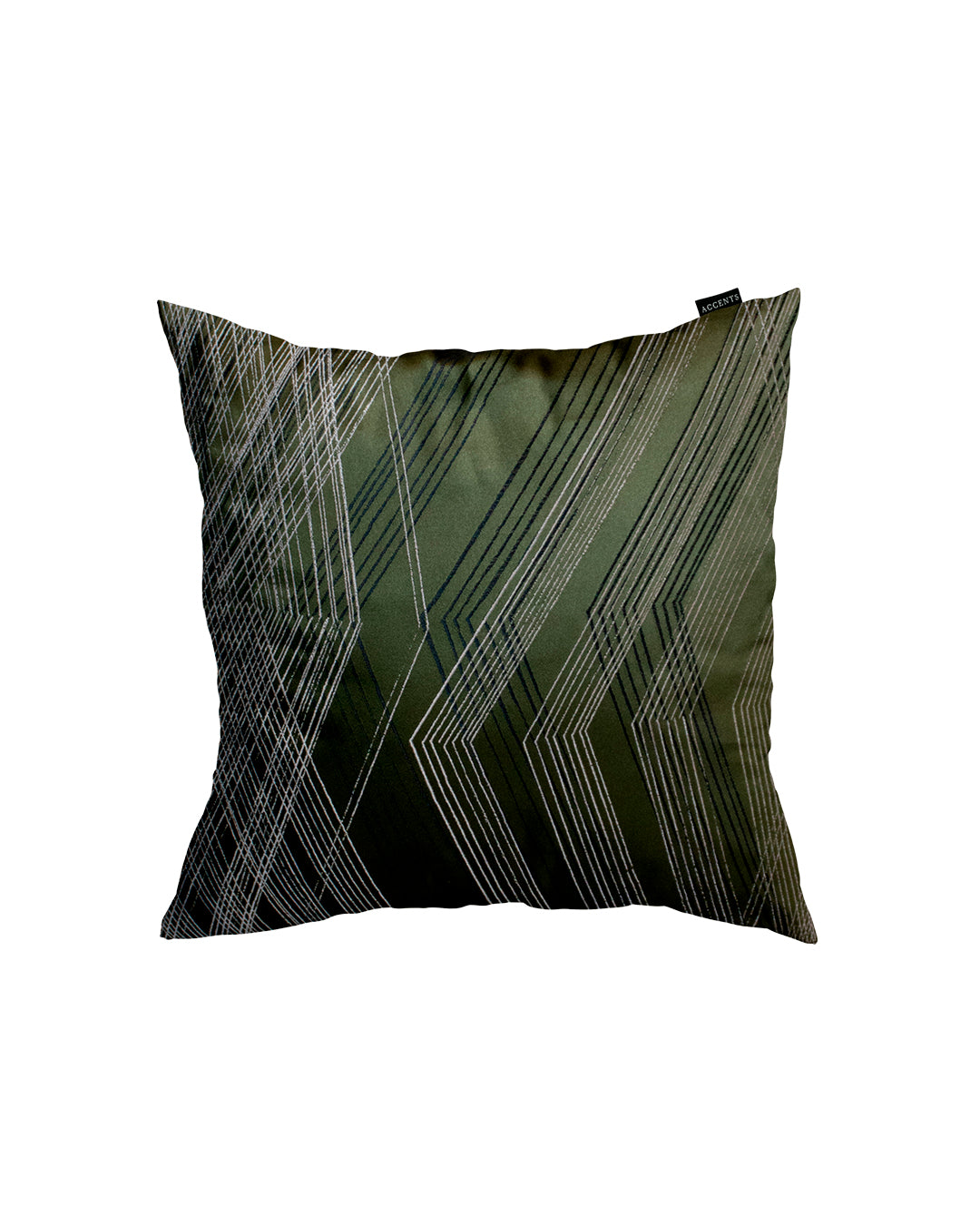 Cojín en tono verde sutil con un acabado brilloso y textura lisa, decorado con bordados en gris y negro que forman un patrón de líneas finas y angulares, que sugieren movimiento y estructura sin perder la sutileza.