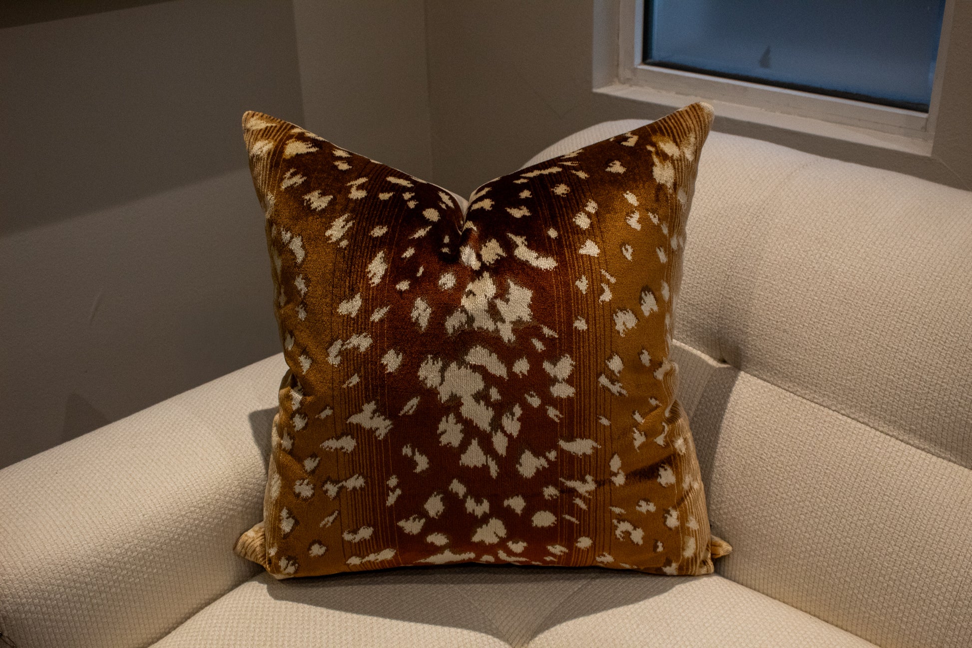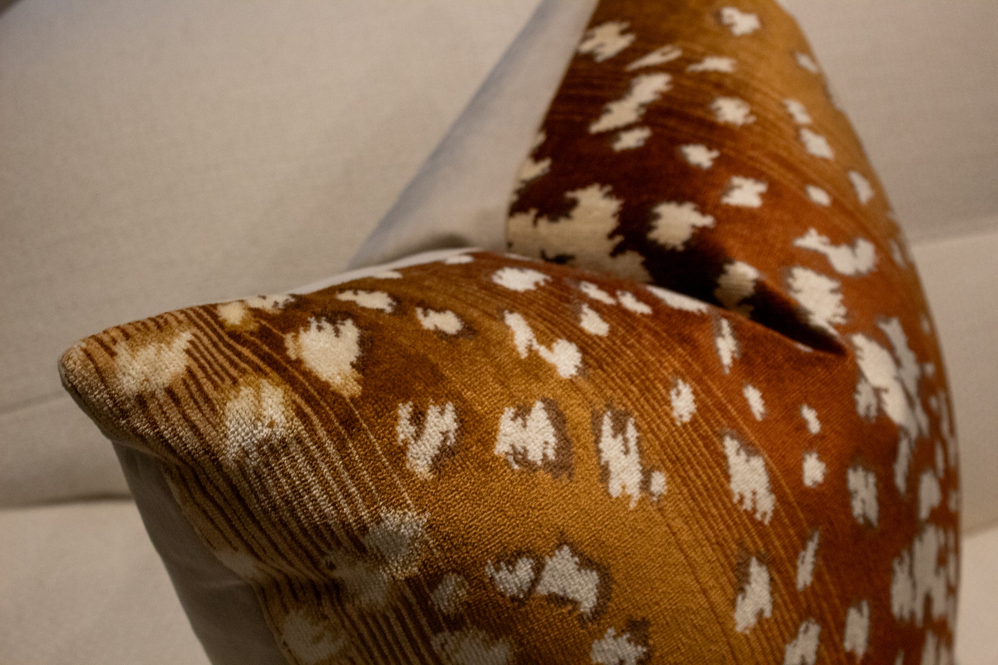 Cojín decorativo de tela con una textura agradable y suave, relleno con pluma y delcrón para un confort superior. Frente con diseño inspirado en la tela Velours Faon de Nobilis, con un patrón orgánico que evoca la piel de venado en tonos cálidos caramelo y beige, aportando profundidad y un carácter natural elegante, y reverso en tela tipo velvet.