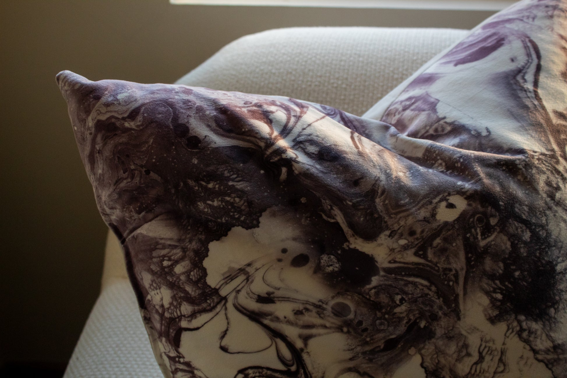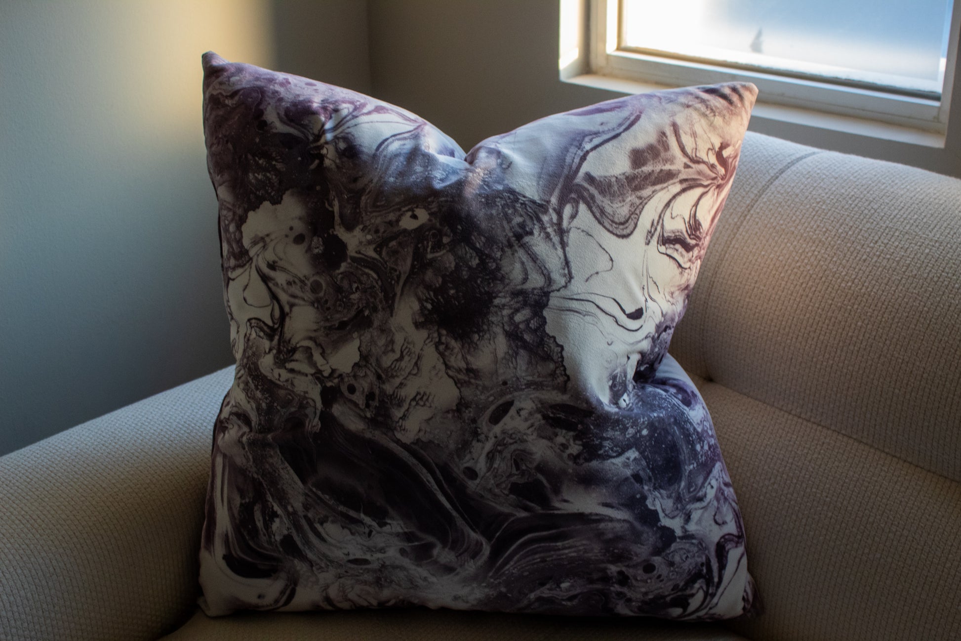 Cojín decorativo de tela con una textura agradable y suave, relleno con pluma y delcrón para un confort superior. Frente con diseño inspirado en la tela Galena Ice, con un patrón abstracto tipo marble ink en escala monocromática, donde las vetas fluidas y orgánicas evocan piedra pulida y tinta en movimiento, y reverso en tela tipo velvet.
