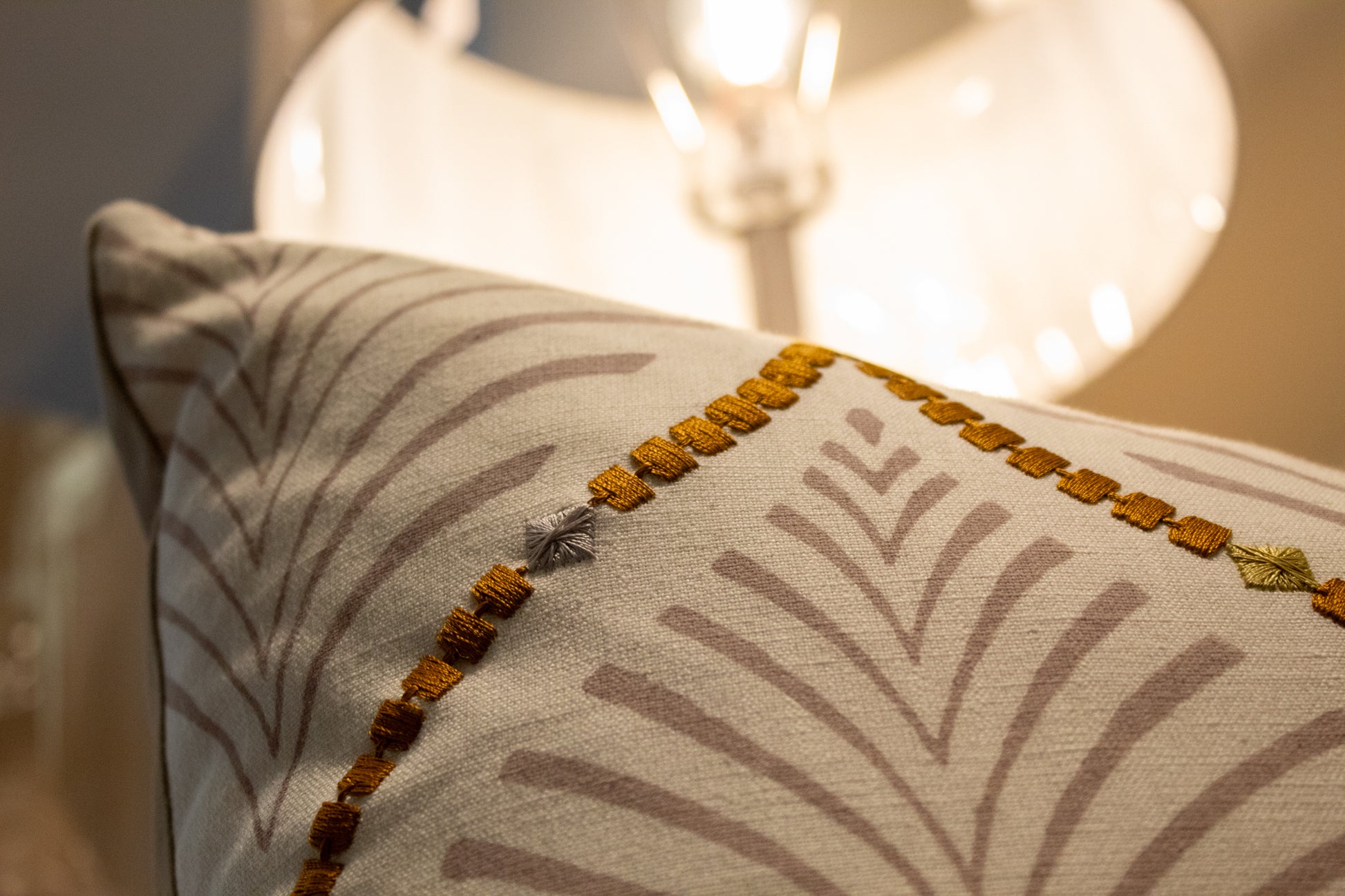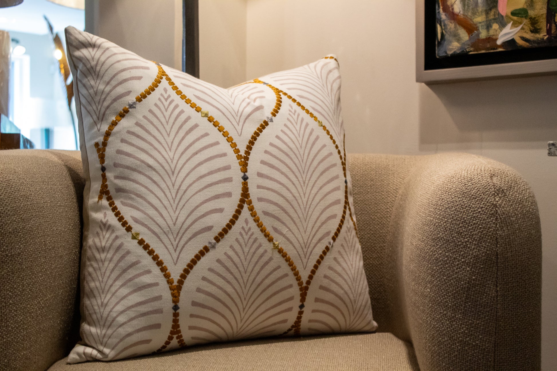 Cojín decorativo de tela con una textura agradable y suave, relleno con pluma y delcrón para un confort superior. Frente estampado con patrón orgánico geométrico inspirado en la tela Jade de Camengo, con formas estilizadas en tonos beige y acentos cálidos que evocan hojas y estructuras repetitivas, y reverso en tela tipo velvet.