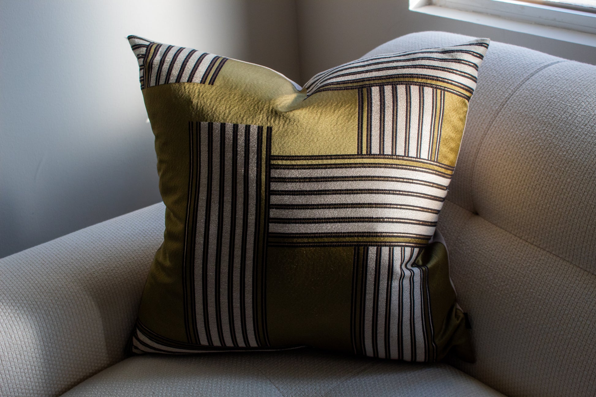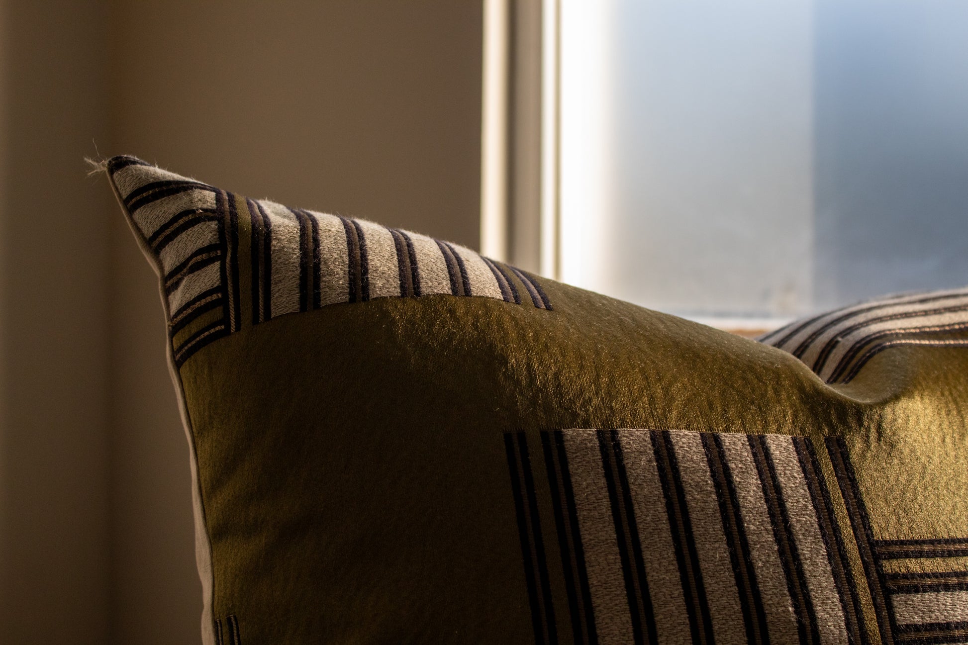 Cojín decorativo de tela con una textura agradable y suave, relleno con pluma y delcrón para un confort superior. Frente con diseño inspirado en la tela Bau de Casamance, con una composición geométrica de bloques y líneas en distintas direcciones que combinan tonos oliva con contrastes en negro y beige, evocando una estética arquitectónica y moderna, y reverso en tela tipo velvet.