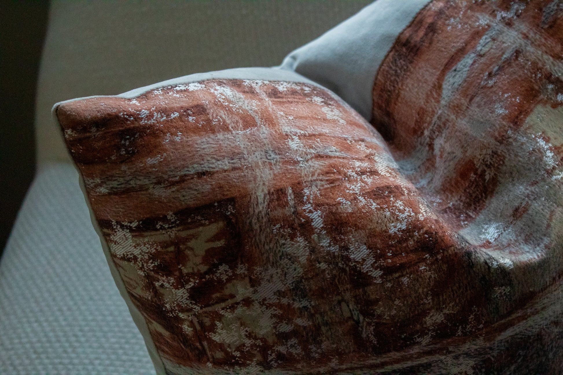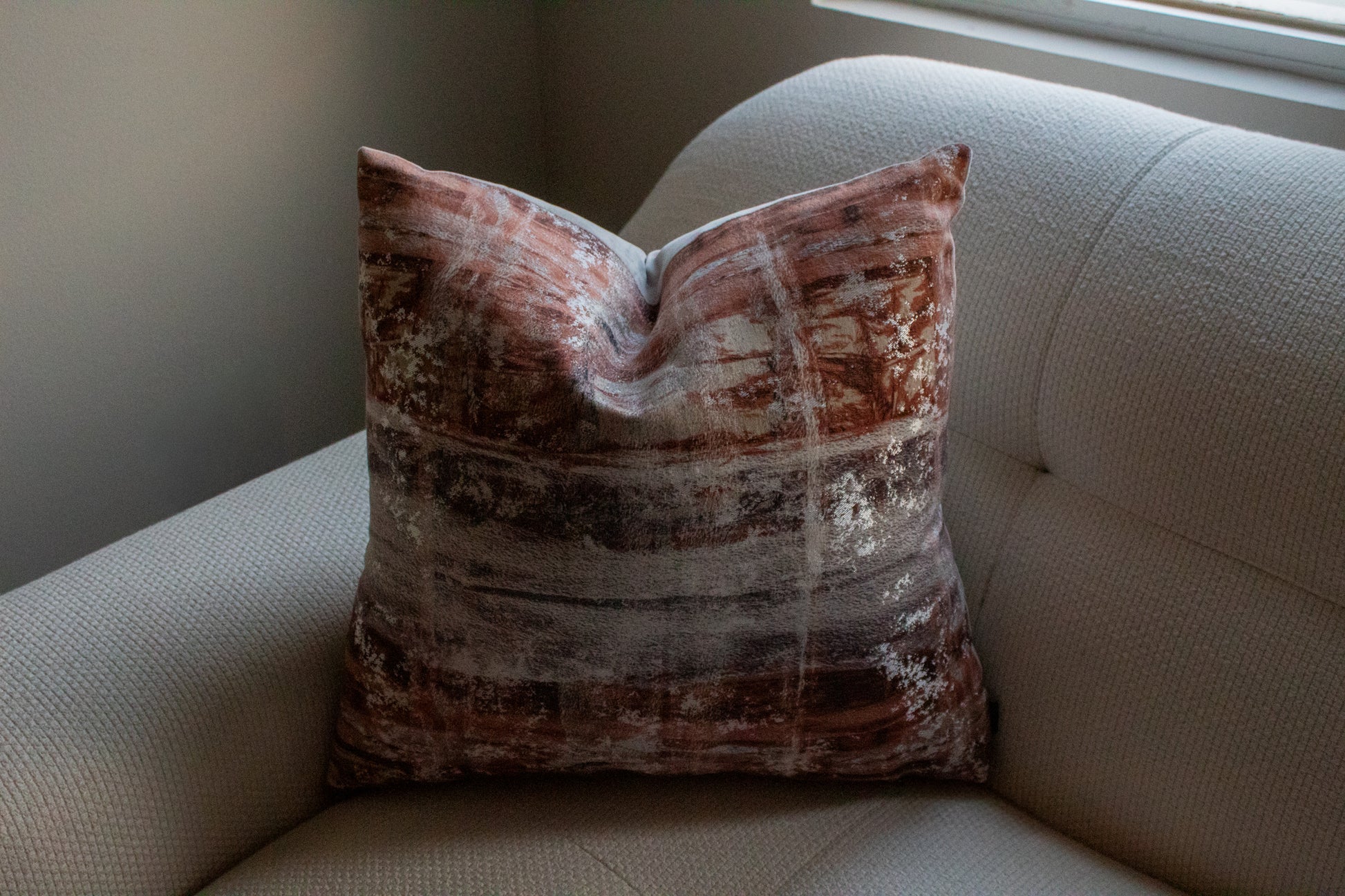 Cojín decorativo de tela con una textura agradable y suave, relleno con pluma y delcrón para un confort superior. Frente con diseño inspirado en la tela Costa Verde de Casamance, con un patrón abstracto de pinceladas horizontales en tonos terracota, gris y arena que evocan superficies naturales y acabados minerales, y reverso en tela tipo velvet.