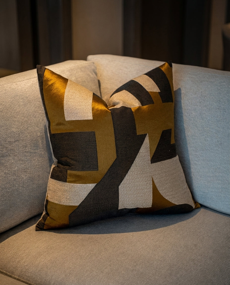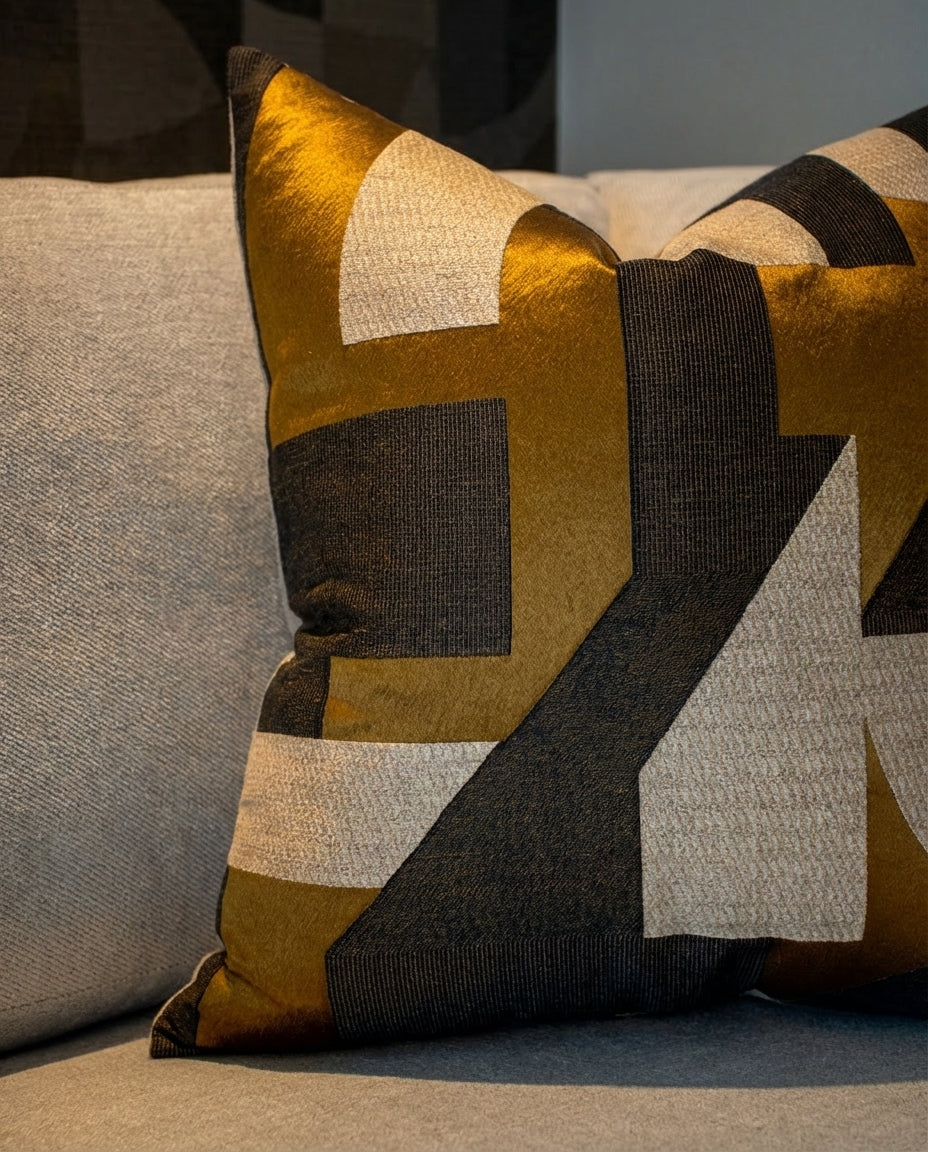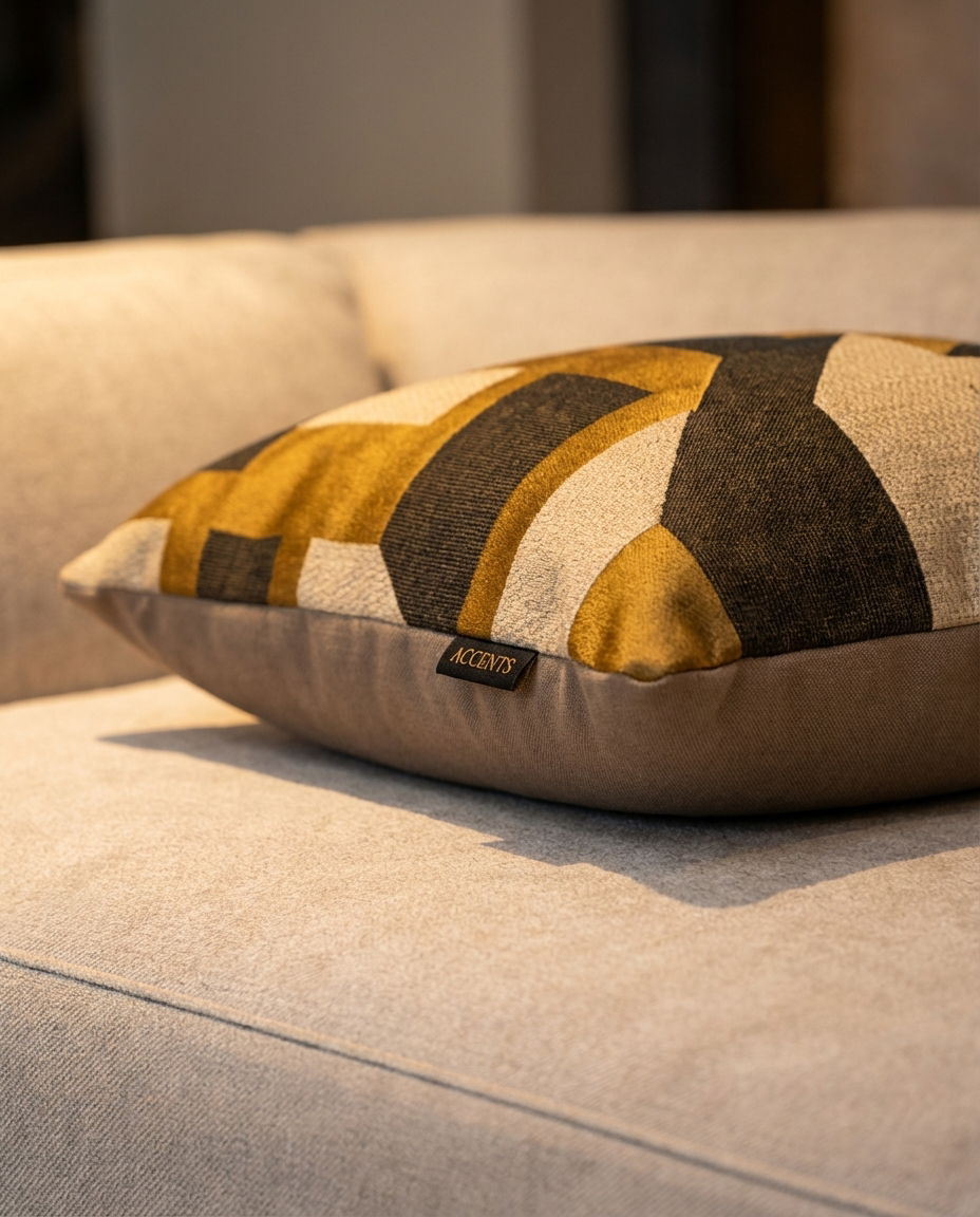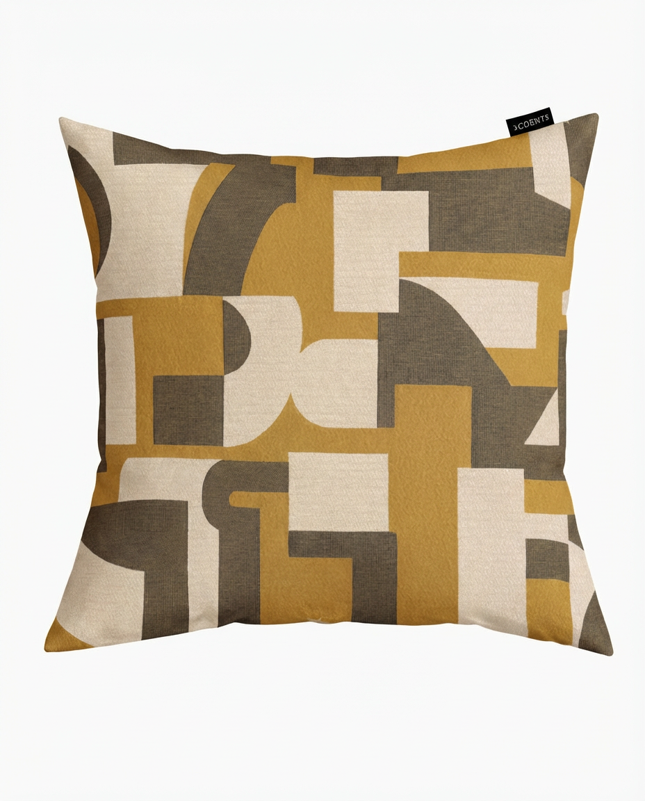 Cojín decorativo de tela con una textura agradable y suave, relleno con pluma y delcrón para un confort superior. Frente elaborado con la tela Influence 10530267 de Casamance, con un diseño geométrico abstracto en tonos mostaza, beige y gris que aporta dinamismo y carácter, y reverso en tela tipo velvet.