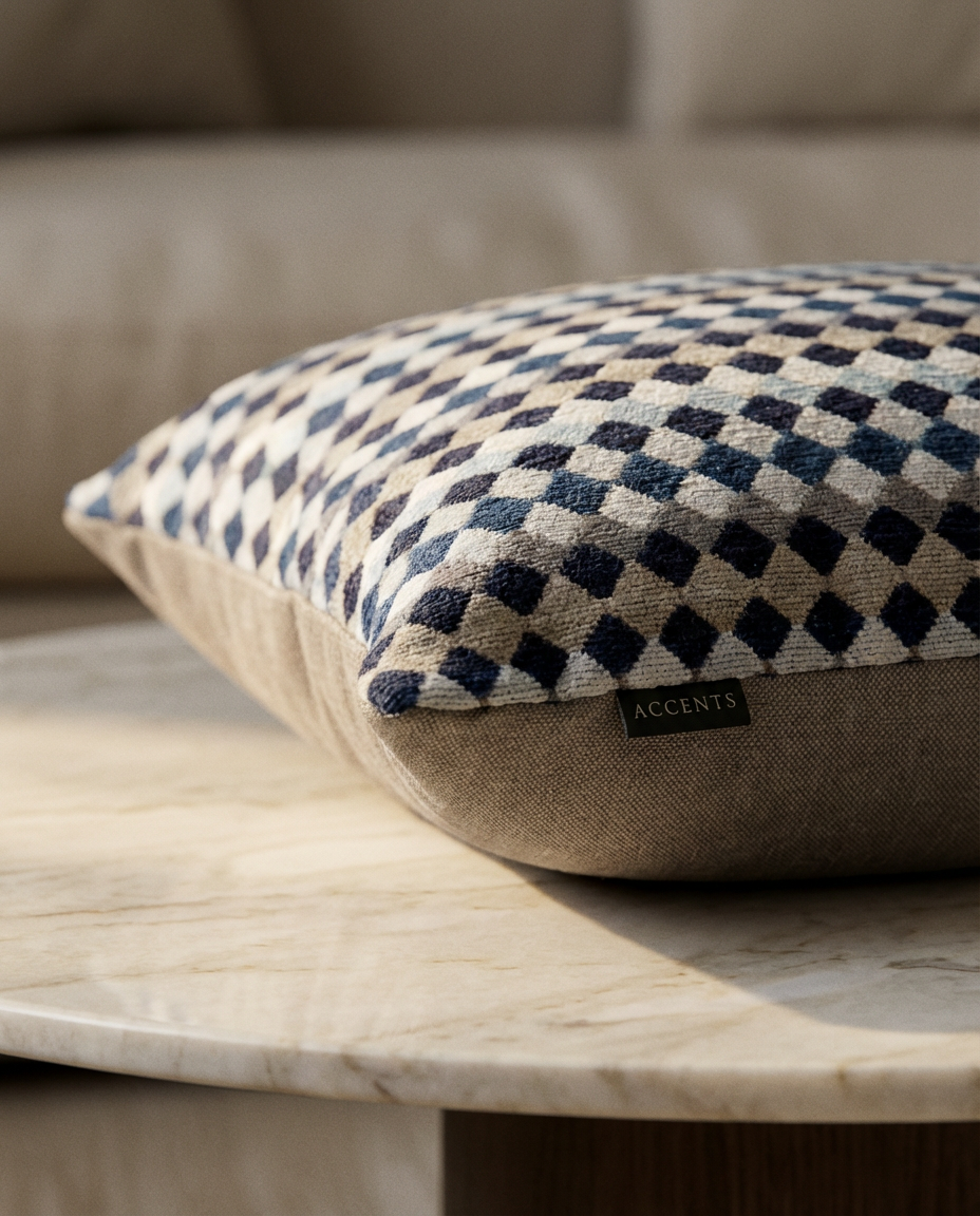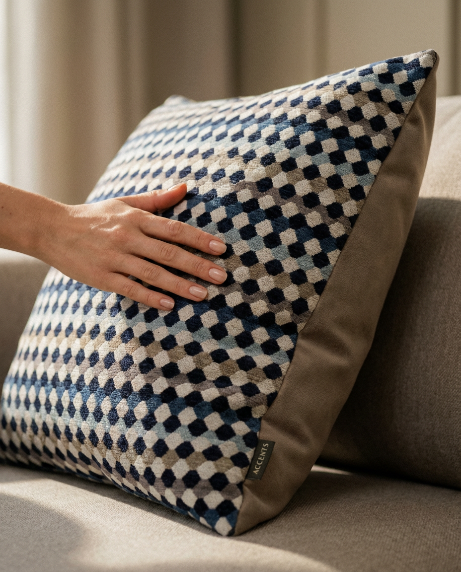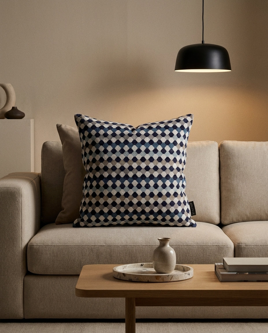 Cojín decorativo de tela con una textura agradable y suave, relleno con pluma y delcrón para un confort superior. Frente con diseño inspirado en la tela Oreta de Romo (colección Arlyn) en tonalidad Twilight, con un patrón geométrico de pequeños hexágonos en tonos azul profundo, gris y beige que aporta ritmo visual y sofisticación, y reverso en tela tipo velvet.