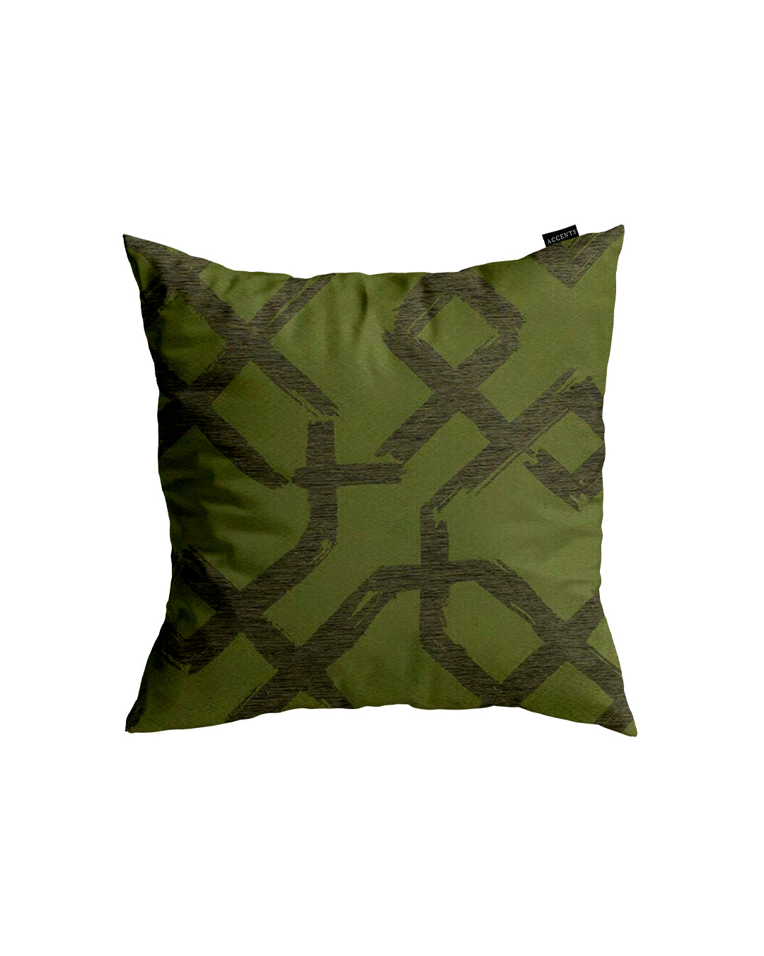 Cojín en un verde sereno y profundo con textura lisa y acabado brilloso, adornado con bordados en tono gris que trazan patrones audaces, como pinceladas expresivas. El contraste de texturas crea un efecto elegante y contemporáneo, aportando carácter sin perder sutileza.