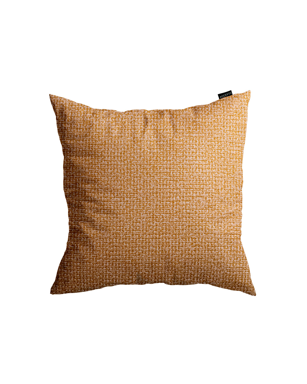 Cojín en tejido de trama cruzada con predominancia en amarillo cálido, matizado por hilos en blanco y beige que crean una superficie visualmente rica, de apariencia tweed y textura marcada. El uso de hilo bouclé aporta relieve y profundidad, mientras que el tejido se percibe inesperadamente suave al tacto.