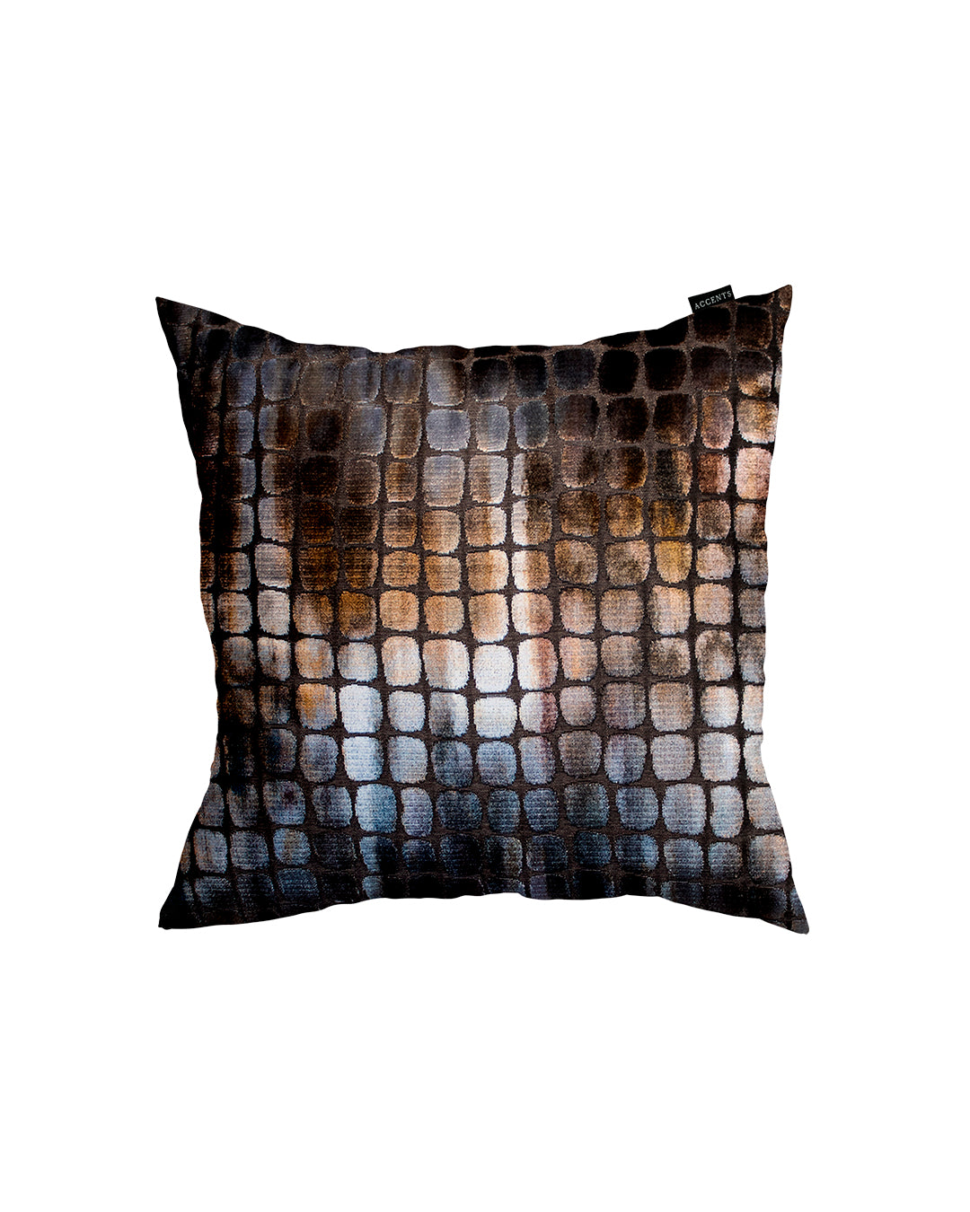 Cojín que combina tonalidades gélidas y delicados tonos degradados. Confeccionado en terciopelo jacquard de extrema suavidad, presenta un patrón de pequeños cuadros en relieve que aportan profundidad visual y una riqueza táctil inusual.