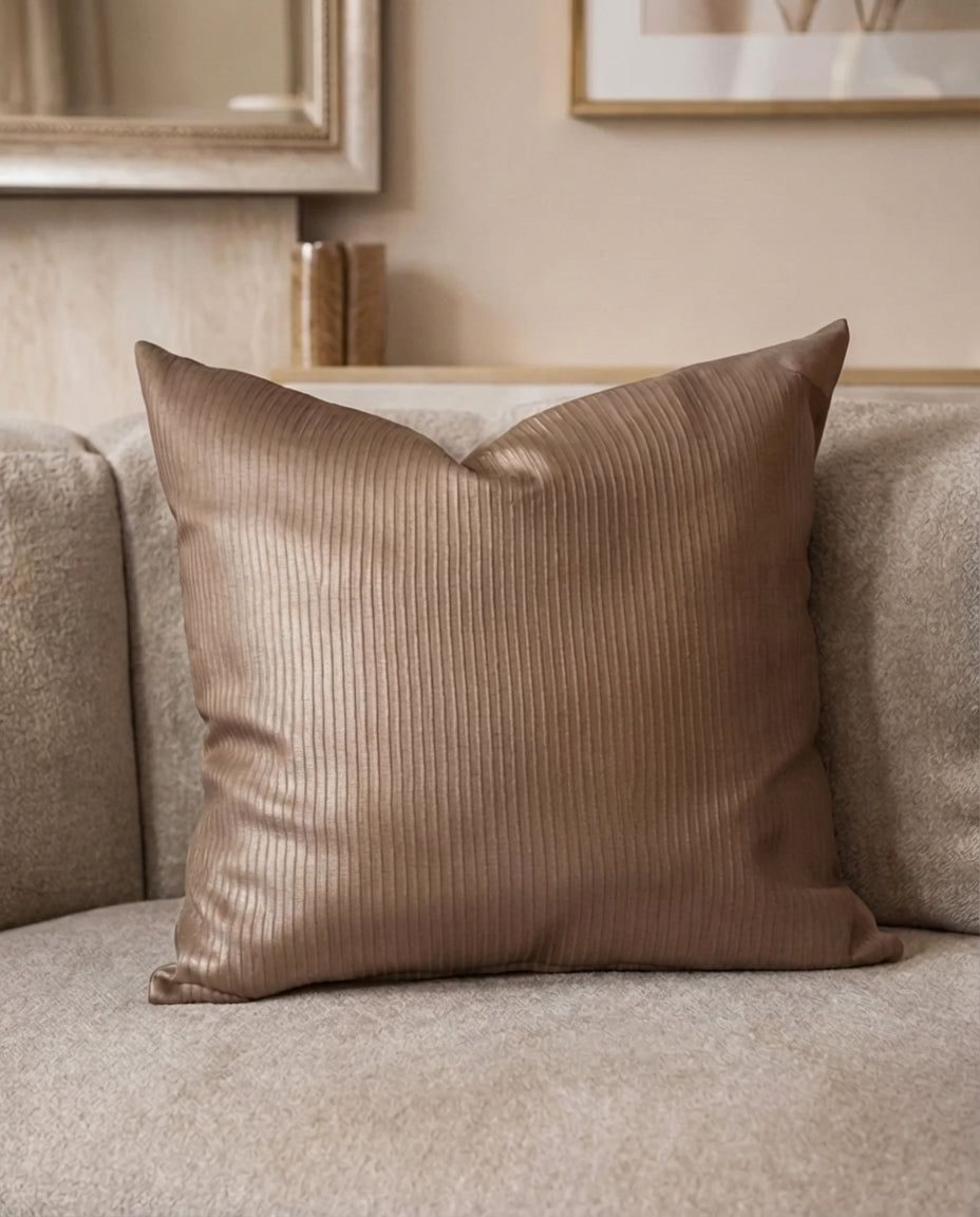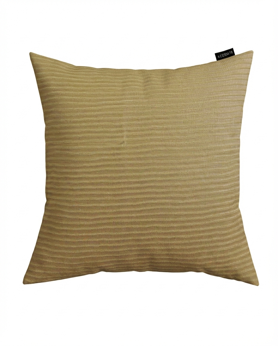 Cojín decorativo de tela con una textura agradable y suave, relleno con pluma y delcrón para un confort superior. Frente elaborado con la tela JA3729 de Maxwell Fabrics, con un sutil patrón lineal en tono dorado-beige que aporta profundidad y elegancia discreta, y reverso en tela tipo velvet.